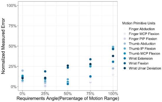 Since the motion range of each motion primitive unit varied widely from 30 to 110 degrees, Equation (1) was used to normalize the average measurement error to better characterize the deviation between the measured results and the actual value.