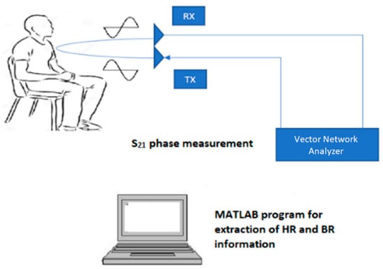 Figure 1 shows a typical setup for HR and BR measurements, which is also used in this paper. Two antennas, one for TX and one for RX, are positioned with their radiating element facing the chest area of a subject sitting at an appropriate distance away. The TX and RX antennas are connected to Port 1 and Port 2 of the vector network analyzer (VNA), respectively. The VNA is set up to measure the S21 parameter, which represents the signal reflected from the subject detected by the RX antenna relative to the incident signal transmitted by the TX antenna. For HR and BR measurements, knowing the phase of S21 is the most critical, as the phase variation provides information about the chest displacement. This phase change can be found by [25].