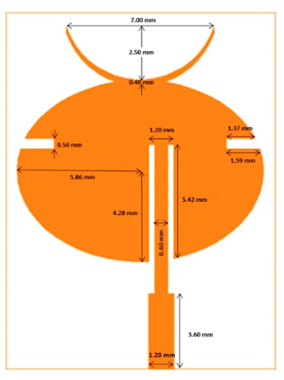 The designed unit cell consisted of a monopole patch, feed element, and ground plane with dimensions as shown in Figure 2. The ellipse-shaped radiating patch had a semi-major axis and semi-minor axis length of 5.86 mm and 4.28 mm, respectively. The elliptical shape offers more parametric degrees of freedom in designing the antenna to the desired performance compared to rectangular- and circular-shaped patches. For the purpose of frequency tuning and to achieve polarization symmetry, two slots measuring 0.5 × 1.59 × 1.37 mm were cut on both sides of the horizontal ellipse. In addition, a top horn structure was introduced to enhance the directivity of the unit cell. The copper thickness of the patch and ground plane was 18 μm as specified in the datasheet of the LCP substrate.