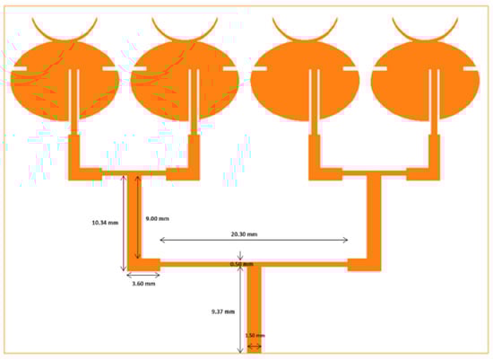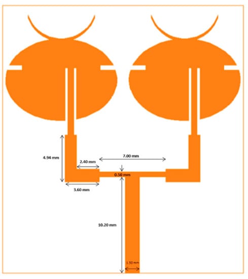 To further improve the gain of the unit cell, arrays using multiple unit cells were designed. Figure 3 shows the designed two-element array. The closest separation between the two elements was 1.6 mm. The feed line was a 50 Ω input, which was split into two 100 Ω lines to power each individual patch. Here, the T-shaped power divider was used along with a quarter wave transformer for impedance matching.