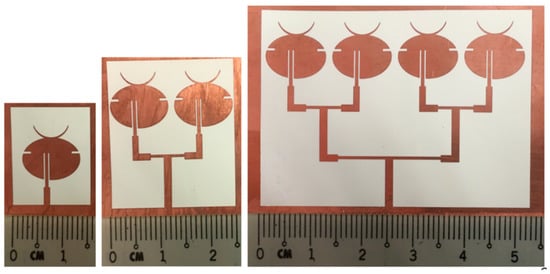 Similarly, a four-element array was designed as shown in Figure 4, where inter-element separation was 1.6 mm. Figure 5 shows the prototypes of all three antenna designs fabricated on a copper-clad LCP substrate of thickness 0.1 mm using photoetching. The performance of both simulated and fabricated antennas is analyzed in the next section.