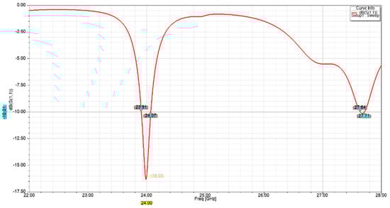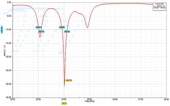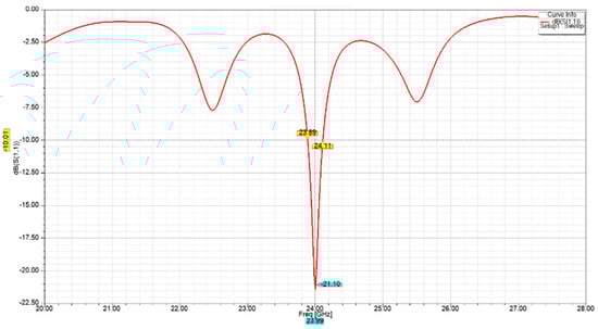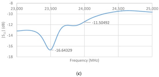 The return loss |S11| is a measure of the impedance mismatch between the feed line and antenna. The lower the |S11|, the less power is reflected and lost through impedance mismatch, and the more power is delivered to antenna. Figure 6 shows that the |S11| of the designed single-element unit cell was lower than −16 dB at the desired operating frequency of 24 GHz.