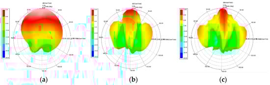 The corresponding 3D polar plot of (a) single-element unit cell; (b) two-element array; and (c) four-element array.