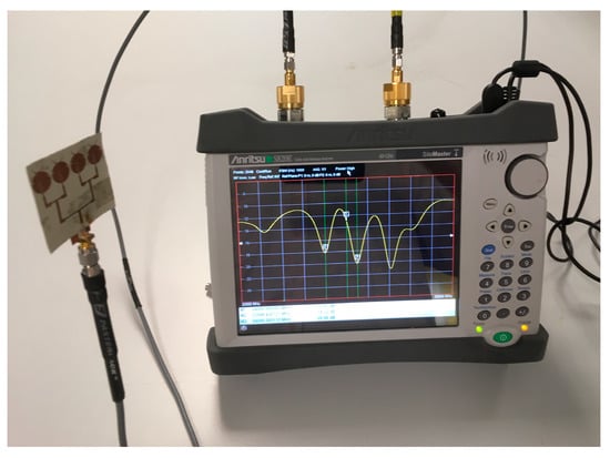 This section presents the performances of our fabricated antennas measured using the Anritsu S820E VNA (Anritsu Co., Morgan Hill, CA, USA). Each antenna was interfaced with the coaxial cable of the VNA using a SMA connector with a specified maximum operating frequency of 26.5 GHz. For the gain measurement, a horn antenna with an operating frequency range of 18–26.5 GHz and gain of 15 dBi was used as the reference antenna. Both reference and test antennas were positioned approximately 1 m apart. Figure 12 shows an example of measuring the return loss |S11| of an antenna prototype using the VNA.