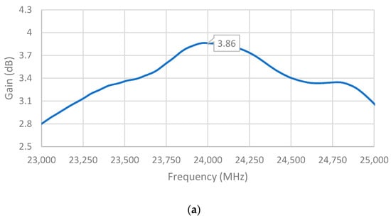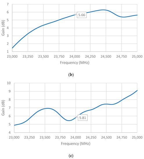 The measured gains of the single-element unit cell, two-element array, and four-element array are shown in Figure 14. It can be observed that the maximum gain of the single-element unit cell was achieved at a frequency very close to the desired frequency of 24 GHz, while those of the two-element array and four-element array occurred at higher frequencies. Notwithstanding, the measured gains of all three antennas at 24 GHz were still significant: 3.86 dBi, 5.66 dBi, and 5.81 dBi for the single-element unit cell, two-element array, and four-element array, respectively, which are comparable to the simulated gains.