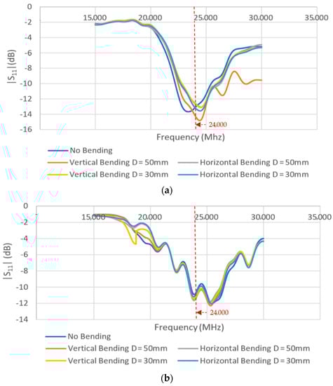 Figure 15 shows the measurement of two- and four-element arrays while bent horizontally (along x-axis) and vertically (along y-axis) on a 50 mm rolled foam. A comparison of the return loss performance of the arrays under different bending conditions is shown in Figure 16. It was observed that the bending did not significantly alter their performance. The antennas can still achieve reasonable |S11| values (<−10 dB) at the desired frequency of 24 GHz.