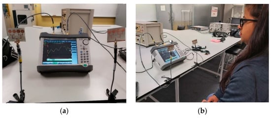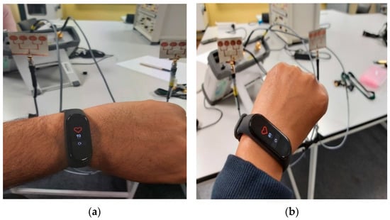 Figure 17 shows an example setup using 2 four-element arrays (one for TX and one for RX) to measure the heart rate (HR) and breathing rate (BR) of a subject sitting approximately 60 cm from the antennas. As mentioned earlier, the setup measured the phase of S21, which was then processed by a MATLAB program to extract the HR and BR information. The HR/BR of two subjects (one male, one female) were measured and the effectiveness of both the two- and the four-element arrays were evaluated. For each subject, the estimated HR/BR were averaged over three measurements (each acquires 2048 signal samples over 18 s) and compared with their ground truth. The true HR was measured by a wrist-worn HR monitor (Figure 18), while the true BR was manually monitored by the subjects counting the number of breathing cycles during the measurement.