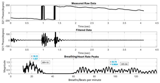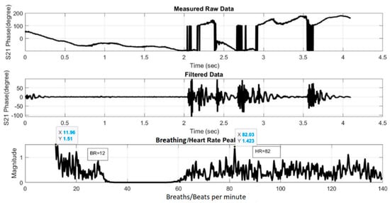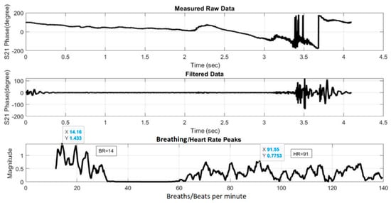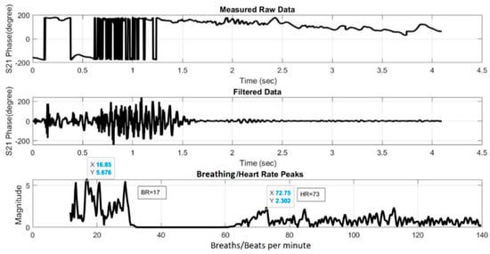 where Δx(t) is the chest displacement. The obtained S21 data is then processed in three steps that can be implemented in a Matlab program to extract the HR and BR information. The three processing steps are: (i) filtering to remove any unnecessary information; (ii) fast Fourier transform (FFT) to convert the time-domain phase signal into the frequency domain; and (iii) peak detection in the frequency spectrum to determine the HR and BR information. The following outlines in more detail each of these processing steps: