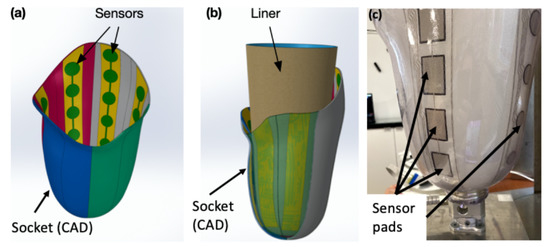 Socket with sensors: (a) CAD of sensors on the inner wall; (b) CAD of liner with socket; (c) actual socket with SocketSense sensors.