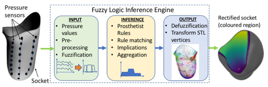 The authors opted to develop the DSS based on a fuzzy inference system, although alternative approaches such as genetic algorithms and neural networks can perform just as well in many cases. Expert systems, and in particular, fuzzy logic have some properties that render them more suitable for the SocketSense DSS, as explained next. Deep learning approaches require vast amounts of data. These data for transfemoral amputees do not exist and would be very costly and time consuming to generate them, since such data would require a large number of amputees. On the other hand, a fuzzy-logic approach based on expert-knowledge and reasoning has the advantage that the solution to the problem can be cast in terms that human operators can understand, so that their experience can be used in the design of the inference engine. This makes it easier to mechanize tasks that are already successfully performed by humans, such as the actions for improvement of the socket design. The use of the sensor measurements provides data about the state of the stump–socket interface which can be processed by a computational algorithm such as the FIS. The architecture of the DSS system is depicted in Figure 2.