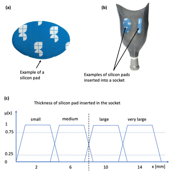 Silicon pads for socket rectification and associated membership function: (a) silicon pad; (b) silicon pad inserted into the inner wall of the socket (sticks due to adhesives); (c) membership function connecting the linguistic variable to pad thickness.