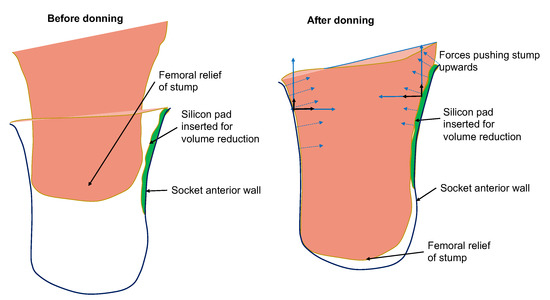 Illustration of rectification action based on silicon-pad insertion for avoiding the development of distal-end pressures. The forces developed by the silicon pad prevent the stump from sliding deep into the socket.