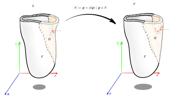 The deformation of a given surface S into the desired surface is described by a displacement function d that associates to each point in S a displacement vector . By this vector, it maps the given surface to its deformed version :
