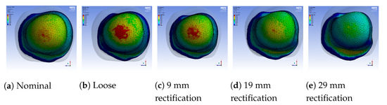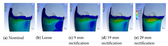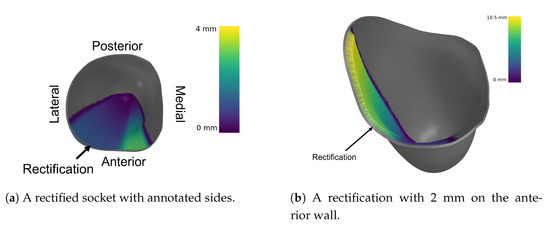 - As the thickness of the rectification increases, a trade-off is observed between offloading pressure from the distal end and increasing the pressure at the proximal areas of the stump. This can be easily seen in Figure 10, Figure 11 and Figure 12. As a result, medium thickness rectification provides the best rectification results, since it balances between offloading the pressure distribution on the distal end of the stump while maintaining relevantly low pressures on the proximal regions.