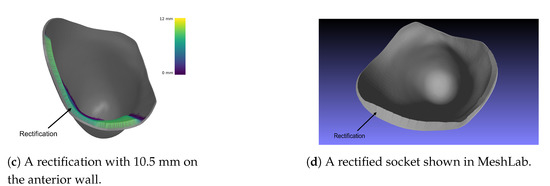 The rationale followed by the developed surface-based deformation algorithm is slightly different than the one proposed in the literature. In SocketSense there are clearly only handle points set by the user implicitly (it is the knowledge of the prosthetist which determines the rule base). The output of the fuzzy inference system is the magnitude of inner volume reduction of the socket (i.e., increasing the thickness of the inner socket wall in specific regions). This translates to the requirement of specific displacements in specific wall regions (determined by the prosthetist’s experience).