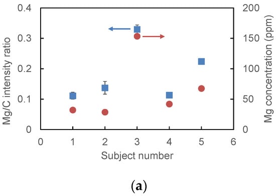 Figure 9 shows the relative mass concentrations of Mg, Zn, and Ca measured for the five subjects compared with the absolute concentrations analyzed via ICP-MS. In the LIBS results in Figure 9, the dots are the average values of three measurements, and the error bars show the minimum and the maximum measured values. The measurement variability was sufficiently small to see individual differences and the trends between the subjects coincided with the results of ICP-MS analysis.