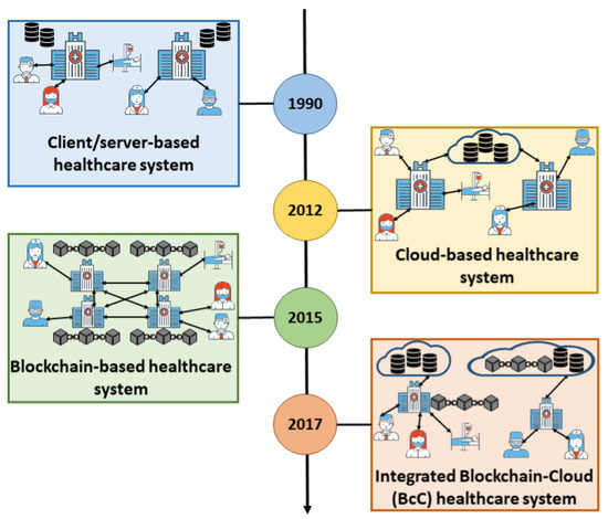 With the emergence of cloud computing, the healthcare system migrated from client/ server-based to cloud-based. Cloud solves the issues of fragmented health records and the high total cost of ownership existing in the client/server-based healthcare system. This is thanks to the on-demand access, replication, and pay-as-use characteristics of the cloud. A cloud-based healthcare system is implemented using a private cloud to allow only authorized data access based on access control rights. Several cloud-based healthcare systems are proposed in the literature where a patient/allied health professional can obtain a cohesive view of the patient’s medical history stored in third-party cloud storage [34,35,36]. Although, cloud-based approach improves system scalability and reduces the total cost of ownership, the health records managed by the cloud service provider are under constant security and privacy threats [37,38]. The patients’ records can be easily tampered with or can be accessed without his/her knowledge [11]. Consequently, a more robust healthcare management system is required to address the shortcomings of the cloud-based approach.