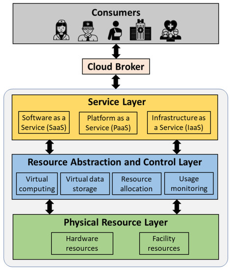 Cloud computing technology offers a shared pool of configurable hardware resources and software services over the Internet [10]. These resources can be speedily allocated and released without the system administrator’s intervention. Cloud computing is mainly characterized by on-demand service, rapid elasticity, pay-per-use model, and multi-tenancy. Figure 2 shows the general overview of the cloud system architecture. The architecture consists of (1) cloud consumers that are individual users (patients and allied healthcare professionals) and/or organizations (hospitals) that uses the cloud services, (2) cloud broker that enables the communication between the cloud consumers and the cloud, and (3) cloud entity that makes the cloud services available to the consumers. The cloud consists of three layers: (1) physical resource layer, (2) resource abstraction and control layer, and (3) service layer. The physical layer consists of the hardware resources for processing, storage, and networking, and the facility resources for cooling, ventilation, power, and supply. The resource abstraction and control layer consists of the system components that enable access to the physical resources through a software abstraction. Abstraction components include virtual computing and virtual storage elements. This layer is also responsible for the efficient allocation and usage monitoring of the physical resources. The service layer consists of the interfaces required to access the cloud services. These services by the cloud are classified into Software as a Service (SaaS), Platform as a Service (PaaS), and Infrastructure as a Service (IaaS). SaaS makes software available remotely to multi-tenant users as a web-based service, google mail for example. PaaS provides the environment and tools required to develop web-based applications, Amazon Web Services for example (Amazon Web Services (AWS) - Cloud computing services: https://aws.amazon.com/, accessed on 27 May 2021). IaaS offers virtualized hardware hosted in cloud data centers to the end-users for operations. The hardware involves storage, computing servers, and network components. NTT communications (NTT communications: https://www.ntt.com/en/index.html, accessed on 27 May 2021) is an example of IaaS.