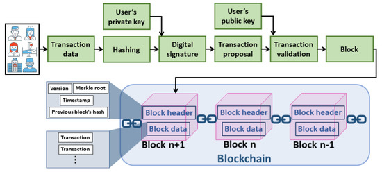 Figure 3 shows how a transaction is processed in the blockchain network. To initiate a new transaction, the transaction data is hashed by the transaction initiator, such as allied health professionals and patients. The digital signature of the transaction is generated by encrypting the hashed data. The encryption is performed using the private key of the transaction initiator. The transaction data and the corresponding digital signature are broadcasted to the network for processing. Each validating node in the network validates the transaction when received. This is by ensuring the authenticity of the transaction initiator and the integrity of the transaction data. The authenticity is verified if the digital signature is successfully decrypted using the transaction initiator’s public key. The integrity is verified if the hashed data obtained from the decryption operation matches the hash of the transaction data. The transaction, if valid, is broadcasted in the network to include it in the block. A miner (node that generates a block) creates a block of the received valid transactions after verifying each transaction for its validity. The selection of a miner that generates a block and the procedure of verifying and appending the generated block to the chain depends on the consensus protocol used by the blockchain network. The consensus protocols in blockchain are classified into compute-intensive-based, capability-based and voting-based [21]. The selected miner generates the hash of the block, also known as the digital signature, and broadcasts the block in the network. The block’s hash is generated by first hashing the block header and then hashing the obtained hashed value. The version in the block header represents the version of the protocol used and the timestamp represents the block generation time. The Merkle root is a single hash value obtained from iterative pair-wise hashing of the transactions in the block data. Each validating node will update their ledger copy by adding the block if valid [21].