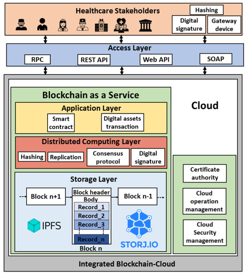 In this architecture, the blockchain platform and its underlying implementation are encapsulated within a cloud environment as shown in Figure 4. We formulate the encapsulated architecture as stated in Equation (1). This architecture has been proposed by several works in the literature [41,42,43,44,45,46,47]. The network participants (users) are the different health stakeholders such as allied health professionals, patients, health insurance companies, pharmaceutical firms, and the health governmental authorities. The allied health professionals include doctors, nurses, dietitians, medical technologists, therapists, and pathologists. The users can connect to the platform via Remote Procedure Call (RPC), Representational state transfer (REST) Application Programming Interface (API), web API, or Simple Object Access Protocol (SOAP). The health records can be generated by the allied health professional upon patient’s visit or by the patient using sensors. A gateway device is used to process the sensor data. The cloud platform consists of a certificate authority, security management module, and operation management module, in addition to the blockchain as a service. The security management module involves identity and access management, cloud firewall, and web application firewall, and the operation management module includes bill management, data replication and recovery, resource monitoring (CPU, memory, and storage usage) and logs service. The blockchain encapsulated within the cloud consists of an application layer, distributed computing layer, and storage layer. The blockchain ledger in the cloud database is stored using the InterPlanetary File System (IPFS) [48] or storj (Decentralized cloud storage—Storj: https://storj.io/, accessed on 27 May 2021). The health transaction execution flow in this architecture is as follows: