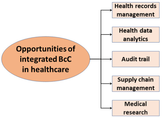 Integrated BcC healthcare system is proposed for different healthcare applications such as health records management [41,42,43,44,45,46,49,50,51,52,53,54,55,56,57,58,59,60,61,62,63,64,65,66,67,68,69,70,71,72], health data analytics [64], audit trail [74], supply chain management [75], and medical research [47] as shown in Figure 6. The healthcare records management systems proposed by [41,42,43,44,45,46] are based on encapsulated BcC architecture, whereas the ones proposed by [49,50,51,52,53,54,55,56,57,58,59,60,61,62,63,64,65,66,67,68,69,70,71,72] are based on non-encapsulated architecture. Nguyen et al. [64] propose a mobile cloud-based Internet of Medical Things framework using blockchain for automated health assessment. The authors use an integrated non-encapsulated BcC system for health data analytics to monitor the progression of neurological disorders. The data stored in the cloud can be accessed through blockchain smart contracts. Zhu et al. [74] proposed a non-encapsulated BcC architecture for the audit trail of healthcare services. The system allows patients to request a paid healthcare service to the cloud. After the end of the service, the patient rates the service provider, and these ratings are stored in the blockchain for audit trail. Celiz et al. [75] propose non-encapsulated healthcare system architecture for supply chain management to track the manufacturing of medical drugs. The data generated using the manufacturing process is stored in the cloud and the data generation events are recorded in the blockchain. Smart contracts are used to ensure the efficient delivery of medical drugs from the source to the destination. For instance, if the shipment is delivered late, then a penalty will be imposed on the supplier using smart contracts. Park et al. [47] proposed an encapsulated BcC architecture for medical research. The authors use blockchain to securely collect and record the evaluation of healthcare remedies such as foods and dietary supplements from different participants. The system uses a cryptocurrency-based reward system to motivate voluntary participation. The proposed system is implemented in the cloud to enhance scalability.