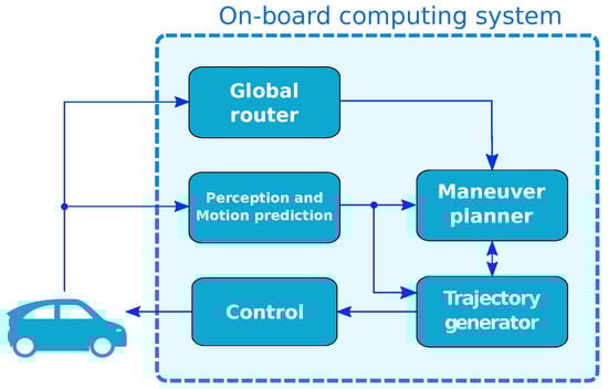 The motion planning architecture proposed in this work is displayed in Figure 1. The system will use a destination point and information of the on-board sensors to generate a proper throttle, braking and steering wheel commands to control the ego-vehicle autonomously.