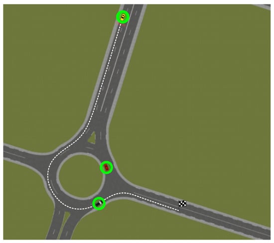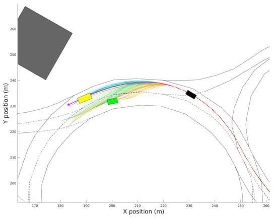A validity check is performed before the generation of speed profiles and the merit evaluation of the trajectory candidates, so only valid path candidates are converted into complete trajectories. Each is considered as valid if (i) its maximum curvature is lower than the maximum curvature feasible by the ego-vehicle and (ii) the area occupied by the vehicle while driving along the path does not include any completely occupied cell in . Figure 6 shows the valid path candidates for a roundabout scenario with two obstacle vehicles (yellow and green). The ego-vehicle (black) is behind the obstacles, and the candidates are generated from a future position of the current trajectory to the waypoints located in the centerlines of the navigation corridors. The red-dotted line shows the trajectory trail followed by the ego-vehicle until the current iteration. The best trajectory candidate, whose selection process is described in Section 4, is highlighted in magenta.