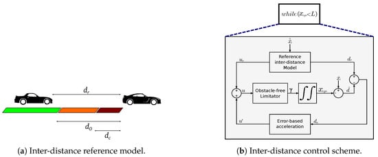 The traffic-based speed profile is created using the inter-distance model proposed in []. This reference model creates a virtual vehicle located at a reference distance from a leader vehicle and determines the required acceleration for the ego-vehicle to keep such distance (see Figure 7a). The are used to feed this model with the leader vehicle positions and speeds so that the ego-vehicle keeps a safe-distance to these points. The inter-distance model only influences the acceleration of the ego-vehicle when the distance to the leader vehicle is lower than a safe nominal constant inter-distance , and the resulting speed-profile will stop the ego-vehicle before reaching the design minimal inter-distance . An acceleration that minimizes the tracking error signal is put together with the reference-model acceleration and then applied to the ego-vehicle as , while considering the obstacle-free speed-profile along the path. This speed-profile generation process is repeated at each planning step for all the path points (i.e., is lower than the length of the path ), as represented in Figure 7b.