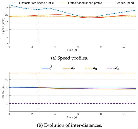 Figure 8a shows the obstacle-free speed profile and the traffic-based speed profile for the best trajectory candidate on the traffic scene of Figure 6, as well as the speed of the leader vehicle. The vertical line in s indicates the ending point of the initial section where the speed profile of the previous trajectory is kept. Figure 8b shows the estimated inter-distance evolution , the reference inter distance , the safe nominal constant inter-distance m and the minimum possible inter-distance between vehicles m (set by design). The tracking error signal increases slightly around s due to the obstacle-free limitations but is reduced again after s.