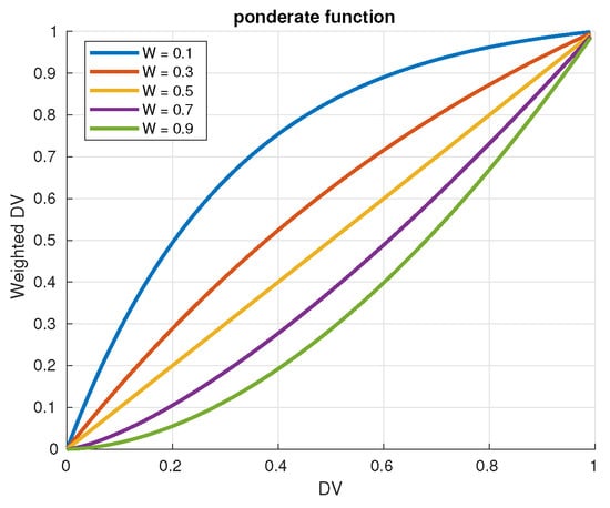 This weighting function is designed to satisfy three properties: (i) it must reinforce the difference between the lower and higher values of when ; (ii) it must decrease the difference between the lower and higher values of when ; (iii) values of near 0 must stay near 0 after being weighted. The weighing function is defined to be bounded in the interval . In order to meet these properties, the weighing function is defined as a piecewise function which depends on the value of . If the value of is lower than , the function is similar in shape to the square root function, and if the value of is higher or equal than , the weighting function has an exponential behavior. The formal definition of this function is as follows: