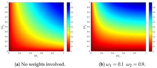 Figure 10 illustrates the performance of the merit function (Equation (3)) when combining two different . Figure 10a shows the merit values after combining the two with a non-weighted geometric mean, where it can be seen that both equally affect the resulting merit. In Figure 10b, and have weights and , respectively. In this case, the variation of does not influence the merit function as much as the variation of , but it gets very close to 0 when values of are near to 0, as expected for property (iii).