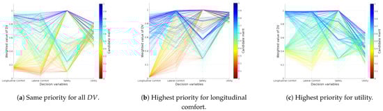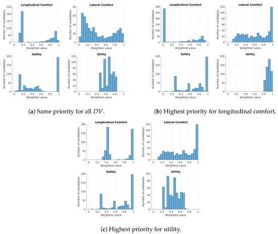 The first configuration, where each has a weight , is used as baseline (see Figure 11a and Figure 12a to see its distribution). The second configuration establishes the highest weight to the longitudinal comfort and sets the weights of the other to 0.1. The effect of this configuration is that the system will be more selective with the candidates according to their longitudinal comfort, and the other will not affect the final merit correspondingly. This behavior can be observed in the histogram distribution of the Figure 12b. Note that in the case of the longitudinal comfort, a great number of candidates obtained a value lower than 0.05, while the performance of the other was improved compared to the distributions of Figure 12a (the number of candidates in the higher bins of the histograms increased). Figure 11b shows that the overall merit of the candidates was increased and that candidates with poor longitudinal comfort performance tend to have low merits, while candidates with better longitudinal comfort performance have a higher merit. In the third configuration, the highest weight is assigned to utility; as a result, the system raises the bar with this , and only the candidates with good utility performance maintain a good value after being weighted. Now the number of candidates tend to be more distributed along the utility histogram, as seen in Figure 12c; besides, the performance of the candidates with regard to the longitudinal comfort increased considerably compared with Figure 12b, and now it does not influence the final merit of candidates as much (there are no red candidates due to the low performance on the longitudinal comfort). In this case, the overall merit of the candidates improved because of the low influence of such as safety or longitudinal comfort in this configuration.