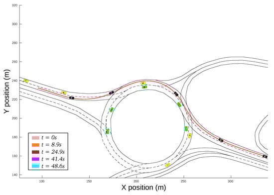Figure 13 shows the vehicle’s evolution inside the roundabout during the complete driving scenario. It can be observed that the ego-vehicle keeps a distance with respect to the yellow vehicle inside the roundabout, and it performs a lane-change in the highway once outside the roundabout. The trajectory does not follow the centerline of the ego-lane in order to increase the lateral comfort, but it does not invade the adjacent lane because that would jeopardize safety. This experiment was carried out with a weight configuration .