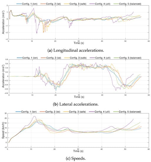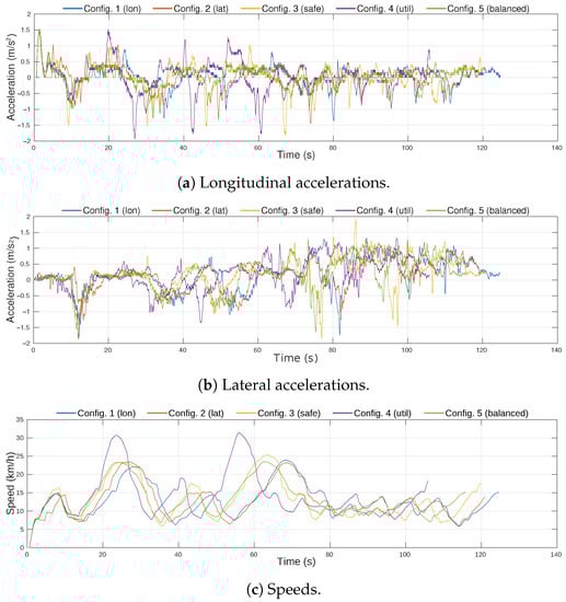Figure 22 shows the acceleration and speed profiles of the five configurations. These data were obtained from the on-board sensors of the vehicle. Since there were no other vehicles involved in this setup, the differences between configurations are higher than in the simulation environment. Regarding longitudinal accelerations (Figure 22a), Configuration 1 and Configuration 5 had the lowest values over time, and Configuration 4 presented the highest magnitudes of both positive and negative accelerations. With respect to lateral accelerations (Figure 22b), Configuration 1 and Configuration 2 kept the lower and more stable values along the route. In the speed profiles graph (Figure 22c), it can be observed that Configuration 4 reaches 30 km/h twice during the route, while the other configurations did not exceed 25 km/h. The traveling time was significantly different in all the configurations, being Configuration 4 the fastest with a traveling time of 105 s, and Configuration 1 the slowest with a traveling time of 124 s.