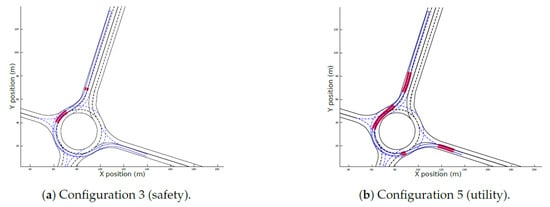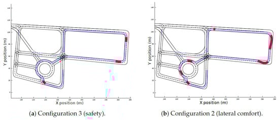 Figure 18a shows the lane invasion for the configuration with best performance in this (Configuration 3), whereas the worst performance, obtained in Configuration 4, is plotted in Figure 18b. The red zones highlight the areas when adjacent lanes were occupied by the ego-vehicle during the travel. In Configuration 3, where safety was prioritized, the lane invasion is low, and even in the red zones, the distance to the border of the lane is almost zero. Conversely, as the priority of Configuration 4 was utility, straighter candidates with higher speeds were chosen, even if it that decision compromised safety by invading adjacent lanes.