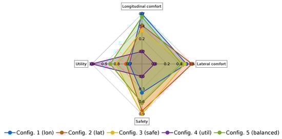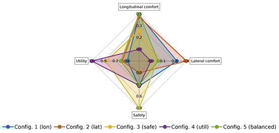 Table 6 shows the numeric values of the resulting in these configurations, and Figure 19 shows a radar plot of the comparing categories after combining the . Configuration 1 showed good performance on longitudinal and lateral comfort, but it had medium and poor performance on safety and utility, respectively. Configuration 2 had good performance in longitudinal/lateral comfort and safety, but it also presented a poor performance with respect to utility. Configuration 3 exhibited a good behavior in terms of lateral comfort and safety, and a medium performance on longitudinal comfort and utility. Configuration 4 had the worst performance in all categories except in utility, where it had the best behavior. The balanced configuration showed a medium-high performance in all categories, with longitudinal comfort almost being the highest one.