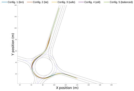 Figure 20 shows the complete path of each configuration along the roundabout scenario. Even though the configurations follow similar paths, in Configuration 4, the lane invasion on the initial segment of the roundabout is very prominent. It can also be observed that Configuration 3 is close to the centerline during the whole scenario.