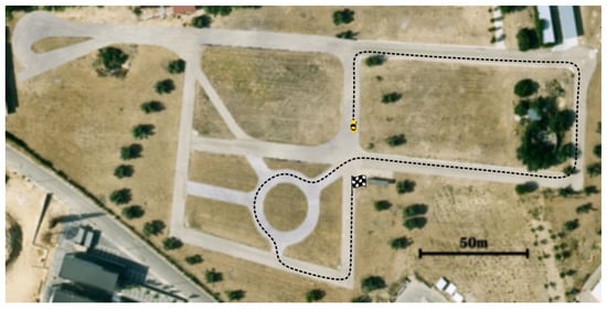 The trials were carried out in the proving ground of the Centre for Automation and Robotics (CSIC), Spain. The vehicle executed three 90° turns before facing a roundabout, then took the third exit and made one last turn before reaching the destination point. Figure 21 shows an aerial view of the testing facilities and the complete route used in this experiment.