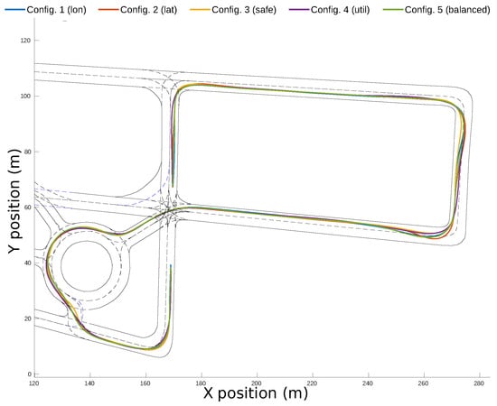 The resulting accelerations and speed profiles of the ego-vehicle in the five experiments are plotted in Figure 17. From the longitudinal acceleration profiles (Figure 17a), it can be observed that Configuration 1 and Configuration 5 had smoother acceleration and their maximum values were small, while the accelerations used in Configuration 4 were the highest. Regarding lateral accelerations (Figure 17b), even though all profiles had a maximum value of ∼0.6 m/s, in Configuration 2, the values were steadier, hence reducing the lateral jerk of the trajectory. The speed profiles, plotted in Figure 17c, show that Configuration 4 reaches the highest value and it gets to the destination point around 4 s before the rest of configurations.