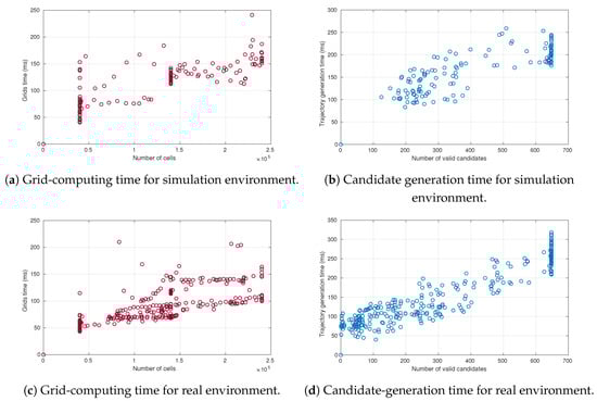 Figure 26 shows the computing time analysis for the two main stages in the motion-planning algorithm: grid-computing and candidate-generation. Figure 26a,c, shows computing times for the grids at each iteration of the algorithm. It can be seen that it increases with the number of cells. In the case of the simulation environment, the grids’ computing time was higher on average than in the real environment due to the need to generate prediction grids for each vehicle present in the scene. Figure 26b,d, shows the time needed to create the trajectory set. It shows a proportional relation between the number of valid candidates and the computing time for generating them. The point distribution in the figures highlights that the simulation environment allowed to obtain more valid candidates along the route than the real environment (83% versus 60%, respectively). This difference can be explained by the different geometry of the roads, as turns are tighter in the real test track, leading to lower number of valid candidates.