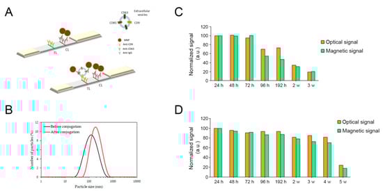 Figure 1C shows the optical and magnetic signals for the different times at room temperature. The optical signal was stable for 72 h, maintaining 100% of the signal. After 72 h, 30% of the signal intensity was lost. After 2 weeks, the optical signal decreased 66%, and after 3 weeks, by 81%. These results indicate that the test should be carried out within 72 h when MNPs-CD63 conjugates are stored at room temperature in order to get the highest efficiency. This decrease could be related to the antibody stability at room temperature, which would affect the conjugates used as labels in the tests. The tendency for the magnetic graph is similar to that observed with the optical readings. The signal was stable for 72 h and then decreased with time.