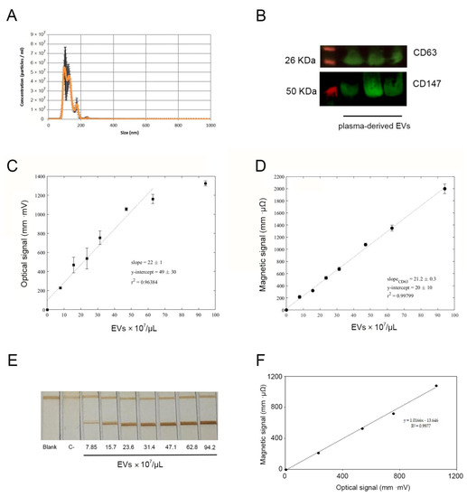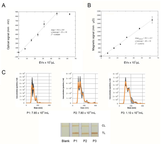 Figure 2E shows the strips performed with different concentrations of EVs isolated from plasma of CRC patients. As corresponds to a sandwich format immunoassay, the signal increases with the concentration. This can be confirmed by observing the intensity of the test lines by naked eye. Figure 2C,D show the quantitative analysis for optical and magnetic sensor, respectively.
