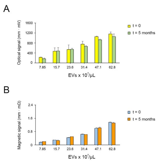 In order to calibrate the system, different concentrations of EVs purified from human plasma in the range of 7.85–94.2 107 EVs/µL were used. The protocol to perform the tests was explained in Section 3.1 using anti-CD63 as the detection antibody. Subsequently, the optical and magnetic signals were analyzed to study the relationship between the analytical signals and the concentration.