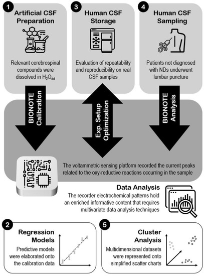 BIONOTE is a sensor for voltammetric analysis of fluids which has been used already for clinical applications with promising results. Indeed, it has been tested to analyze pleural, ascitic, lower-limb ulcers liquids, and urine [11,12,13]. Here, instead, it was studied for the first time with CSF, the liquid in which the CNS is immersed, whose analysis is critical to diagnose neurological disorders, including NDs.