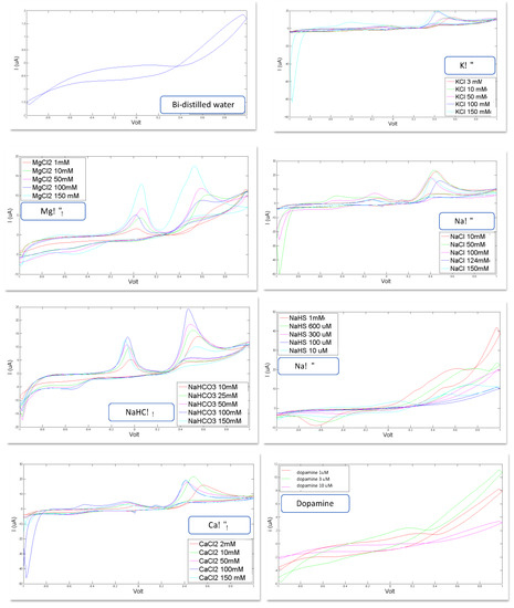 Voltammograms registered for the following constituents for different concentration levels: reference bi-distilled water KCl (3, 10, 50, 100, 150 mM, MgCl2 (1, 10, 50, 100, 150 mM), NaCl (10, 50, 100, 124, 150 mM), NaHCO3 (10, 25, 50, 100, 150 mM), NaHS (10 µM, 100 µM, 300 µM, 600 µM, 1 mM), CaCl2 (2, 10, 50, 100, 150 mM), Dopamine (1 µM, 3 µM, 10 µM).