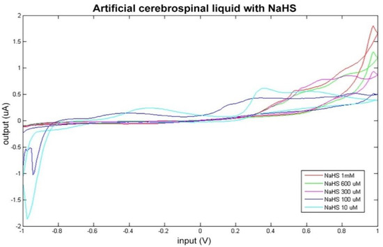 Cyclic voltammetry fingerprint of artificial cerebrospinal liquid with progressive NaHS addition.
