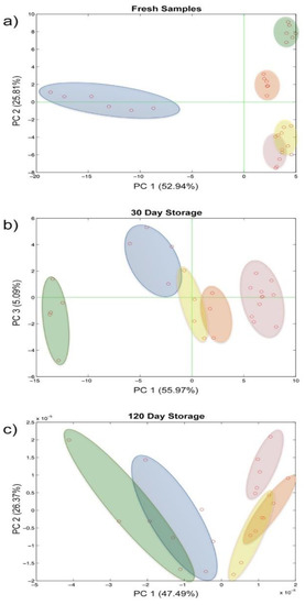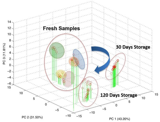 While the fresh samples were clearly distinguishable over the plane along both the PC1 and PC2, these were less divergent already after 30 days of storage and became overlapped in the last time step evaluated (Figure 6a–c). Furthermore, the repeatability of the analytical system also seems to be affected in a certain way by the evolution of the biological sample.
