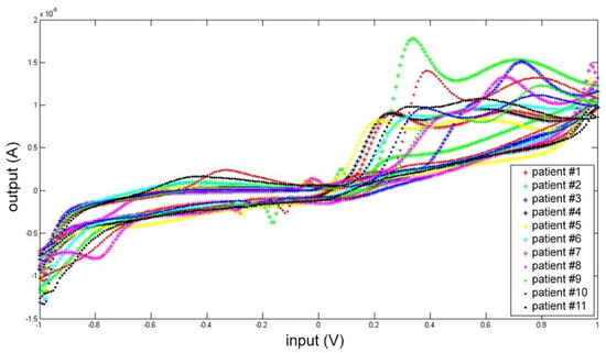 Each CSF was measured five times, and the mean electrochemical fingerprints over the five cycles have been calculated and represented in two figures: all the voltammograms together, overlapped in the same graph (Figure 7); and a graph for each single patient (Figure 8).