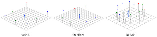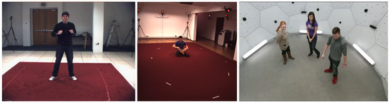 Aiming at analyzing social interaction, Joo et al. [10,11] recorded the Panoptic Studio dataset. In its current state (Version 1.2), it is comprised of 84 sequences with more than 100 subjects. The sequences are very diverse, among others covering: social games (Haggling, Mafia, and Ultimatum) with up to eight subjects; playing instruments; dancing; playing with toddlers; and covering range of motion. In contrast to the other datasets, there is no categorization or segmentation of the actions (beyond the above-mentioned categories of sequences). To record the dataset, Joo and colleagues built the Panoptic Studio, a special dome with more than 500 cameras in its walls. Using these cameras, Joo et al. [10,11] developed an algorithm for obtaining multi-person 3D skeleton joint ground truths without markers. Their algorithm was based on 2D body pose estimation providing “weak” proposals, triangulation and fusion of the proposals, and temporal refinement.