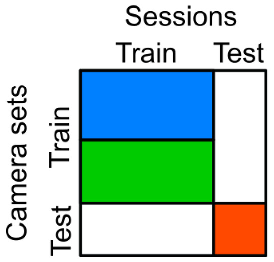 Separation of the training and test sets for the subject sessions and camera sets (blue: reduced training camera set; blue and green: full training camera set; red: test camera set; white: unused data).